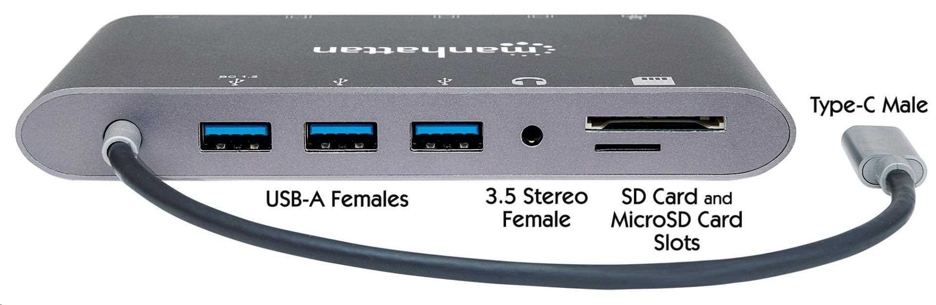 MANHATTAN Dokovacia stanica USB-C na HDMI, Mini DP, VGA, 3xUSB 3.0, port USB-C PD, RJ 45, čítačka kariet, 3,5 mm