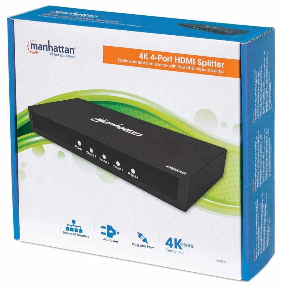 Manhattan HDMI Splitter, 4K 4-portový HDMI Splitter, 4K@60Hz, napájanie AC, čierny