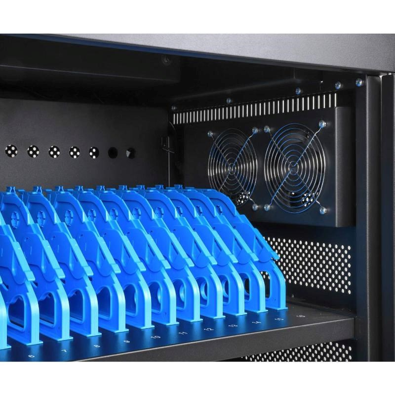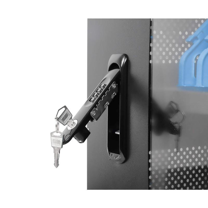 Pevný a odolný oceľový kryt tohto nabíjacieho vozíka ponúka viditeľnú známku profesionálneho riadenia a ochrany zariadení. Zámok na predných a zadných dverách je možné otvoriť štvorciferným kódom alebo dvomi priloženými kľúčmi, ktoré pomáhajú udržať zariadenia v bezpečí počas nabíjania alebo keď nie sú používané. Zahrnuté robustné kolieska vám umožnia premiestniť vozík, kam potrebujete; zámky kolies umožňujú rýchle zabezpečenie na mieste.