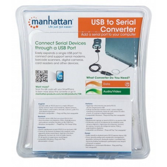 väčšina moderných počítačov a prenosných počítačov nemá porty RS232 (DB9), čo takmer znemožňuje používanie starších periférnych zariadení a high-tech zariadení, ktoré sa pripájajú pomocou portov COM. Prevodník Manhattan USB na sériový port â" so sériovým portom RS232 (DB9) a čipovou sadou Prolific PL-2303RA â" ľahko rozšíri jeden port USB na pripojenie a podporu sériových modemov, snímačov čiarových kódov, digitálnych fotoaparátov, čítačiek kariet, rádií Ham/Amateur, GPS, CNC strojov, teleskopov, vyšívacích strojov, regulátorov vstrekovania paliva, PDU, sieťových prepínačov a ďalších zariadení.