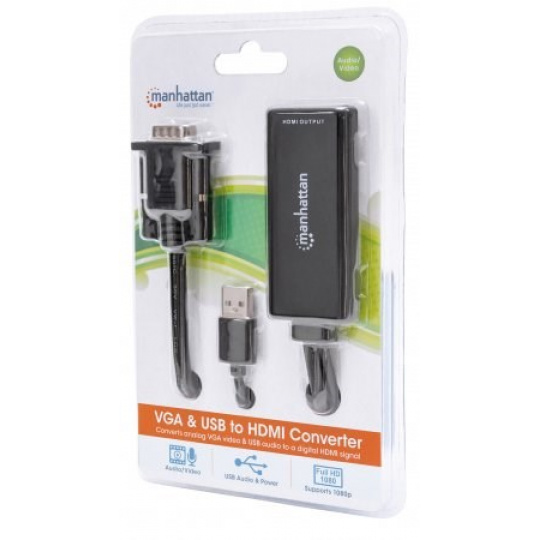 Prevodník Manhattan VGA a USB na HDMI prevádza analógové audio/video signály z PC na formát HDMI pre kompatibilné projektory, ploché HD displeje, televízory a ďalšie zariadenia. Pokročilé zabudované obvody vám umožňujú jednoducho si vychutnať médiá z počítača na displejoch alebo televízoroch s vysokým rozlíšením a zachovať súčasný príjem A/V signálu v zdrojovom počítači. Vysoká šírka pásma podporuje rozlíšenie videa až do 1920 x 1080 a 1080p@60Hz, čo sa výborne hodí na školenia, maloobchodné účely a výstavy. Rýchla inštalácia Plug and Play a kompatibilita so systémami Windows a Mac znamená, že prevodník Manhattan VGA a USB na HDMI uľahčuje poskytovanie digitálneho obsahu uloženého v akýchkoľvek stolových počítačoch a notebookoch.