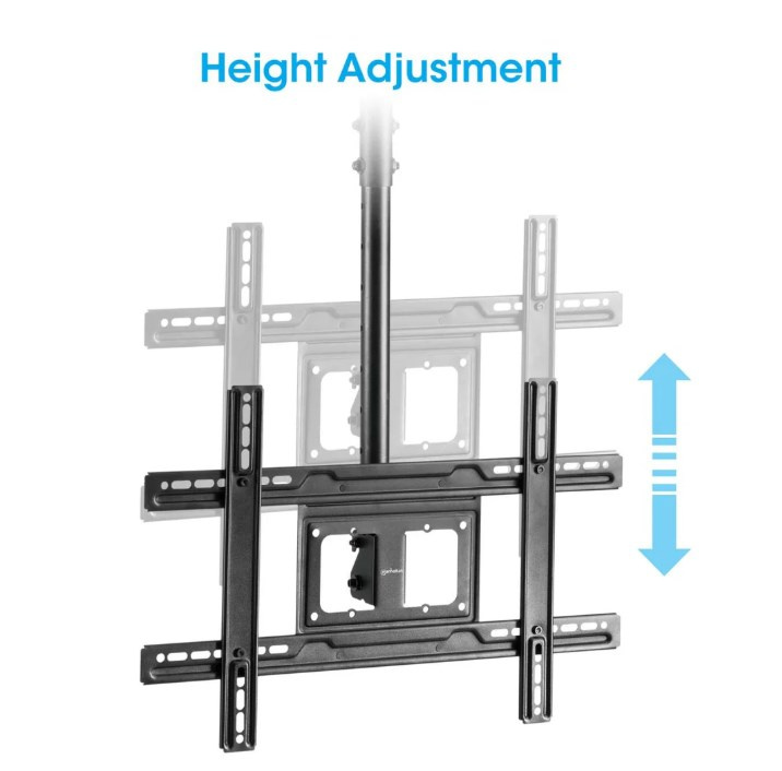 Zlepšite uhol pohľadu, keď je miesto na stene a podlahe obmedzené alebo nie je možné inštalovať televízor nízko nad podlahou. Tento stropný držiak na televízor Manhattan pojme LCD, LED alebo plazmový displej s uhlopriečkou 37" až 80" a hmotnosťou až 50 kg. Jeho práškovo lakovaná, odolná oceľová konštrukcia zabezpečuje bezpečnú a spoľahlivú inštaláciu nad hlavou.