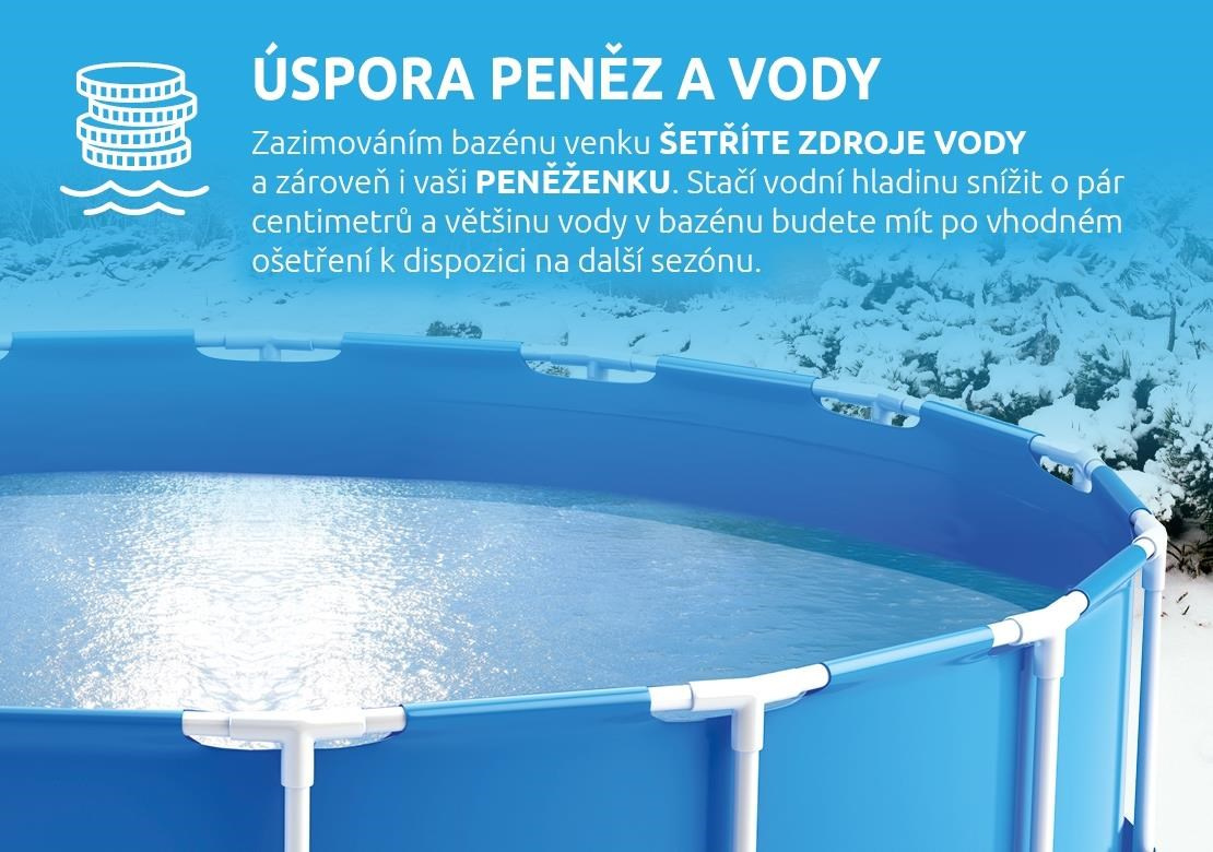 Zazimovaním bazéna vonku sa šetrí vodné zdroje a znižujú sa náklady na vodné a stočné. Vhodne ošetrená bazénová voda vydrží do ďalšej kúpacej sezóny a nebude potrebné znovu celý bazén napúšťať.
