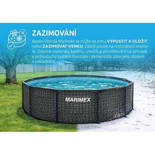 Bazén Florida Marimex se může na zimu vypustit a uložit, nebo zazimovat venku. Záleží pouze na rozhodnutí majitele. Odolné materiály bazénu umožňují přezimování na zahradě a jednoduchý systém montáže i demontáže zase jeho složení a uskladnění.
