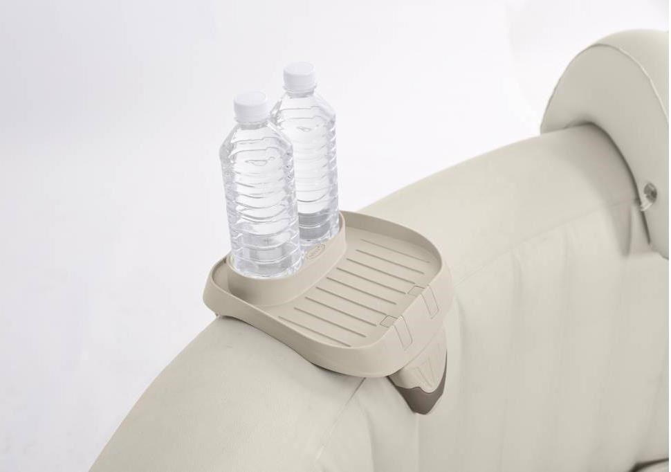 Praktický držiak na nápoje, ktorý slúži na odkladanie drobností alebo malého občerstvenia a má dve otvory na fľaše. Držiak je určený pre nafukovacie vírivky Intex Pure Spa. Hodí sa pre všetky nafukovacie vírivky s hrúbkou steny medzi 20-24 cm.