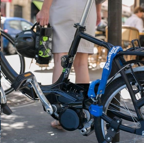 Pevný oceľový reťaz s oceľovým visacím zámkom je 90 cm dlhý a obsahuje oceľové spojky s priemerom 6 mm, ktoré odolávajú rezaniu. Nylónový kryt reťaza zabraňuje poškrabaniu. Visací oceľový zámok s priemerom 40 mm je odolný voči poveternostným vplyvom. Plastový kryt na visacom zámku zabraňuje poškrabaniu. Tŕň s priemerom 9 mm je vyrobený z ocele pre odolnosť voči rezaniu. Obsahuje 4-četný valček, ktorý zabraňuje rozrušeniu, a dvojitú západku odolnú voči vypáčeniu.