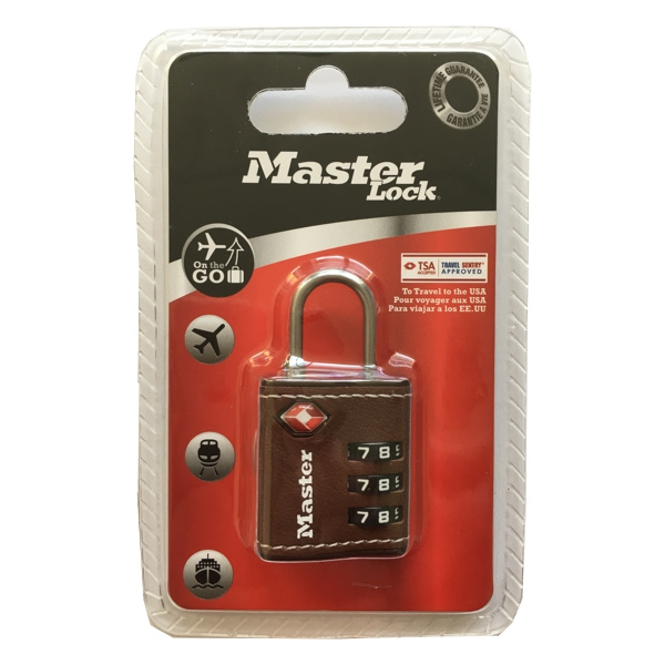 Visací kombinačný zámok o šírke 32 mm pre zavazadlá, schválený agentúrou TSA, má elegantný kožený dizajn. Kovové telo zámku je odolné voči poškodeniu. Tŕň je z ocele o priemere 3 mm a je odolný voči prestrihnutiu a presekaniu. Obsahuje nastaviteľnú 3-cifernú kombináciu zámku.