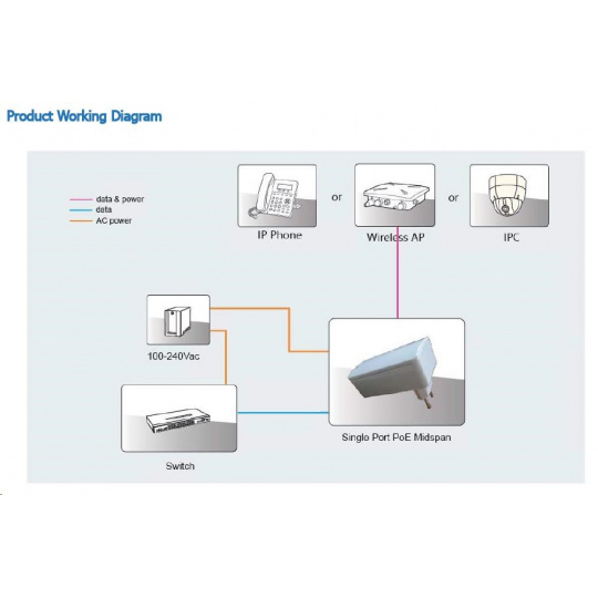 axLink PI15S je vysokokvalitný gigabitový POE injektor s jedným výstupným portom POE na napájanie 802.3af a maximálnou spotrebou energie do 15,4 W. Injektor PoE sa pripája priamo na vstup. Napájanie je vedené po vodičoch 4,5 (+) a 7,8 (-). Napájací injektor je vhodný najmä na napájanie IP kamier, telefónov VoIP atď...