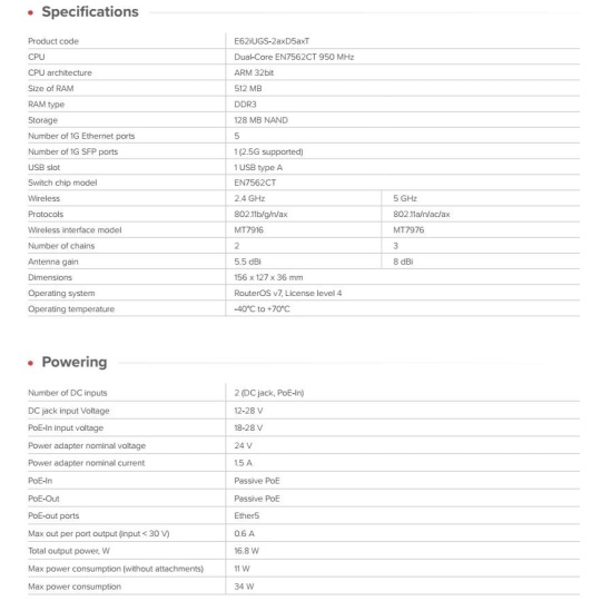 hAP ax S – nejvýhodnějším přístupový bod Mikrotiku s Wi-Fi 6. Levnější než většina sériově vyráběných wifirouterů střední třídy a přitom nabízí mnohem větší flexibilitu.  Pod elegantním vnějším pláštěm se skrývá dvoujádrový procesor ARM, dvoupásmové Wi-Fi 6, USB, pět gigabitových ethernetových portů a 2,5 gigabitová SFP šachta. Můžete se připojit přímo k optickému kabelu nebo propojit vysokorychlostní NAS pro bleskurychlý místní přístup.  Triple-chain 5GHz: klíč ke stabilnímu Wi-Fi v gigabitové třídě Nový hAP ax S je vybaven triple-chain 5GHz rádiem, které dosahuje reálné propustnosti kolem 800–900 Mbit/s. To znamená plynulé streamování, rychlejší stahování a stabilní výkon na více zařízeních.  Je také ideální jako specializovaný přístupový bod Wi-Fi 6 VR pro streamování pro PC VR headsety, který nabízí vyšší rozlišení a nižší latenci bez kabelů. Na rozdíl od jednoúčelových „herních“ přístupových bodů vám hAP ax S nabízí plný výkon, flexibilitu a funkční budoucnost v stále zdokonalovaném RouterOS v7.  Flexibilní napájení AP skýtá dvě možnosti napájení – přes DC konektor nebo PoE-in – dále integrován pasivní port PoE-out. PoE-out port využijete pro napájení dalšího zařízení MikroTik, jako je například další AP nebo kompaktní stolní switch.  Vaše síť, Vaše pravidla Navzdory nízké ceně běží hAP ax S na plné verzi RouterOS v7, nejflexibilnějším síťovém softwaru na trhu. V době rostoucích výzev v oblasti zabezpečení dat a ochrany soukromí vám RouterOS poskytuje úplnou kontrolu – bez předplatného, bez upsellů, bez uzamčených funkcí. Ať už konfigurujete svou první Wi-Fi síť prostřednictvím aplikace MikroTik nebo budujete složité topologie, RouterOS v7 roste s vámi.  VLAN, firewally, VPN tunely, tvarování provozu, skriptování, automatizace SMS – možnosti jsou neomezené. Například: můžete snadno izolovat zařízení IoT do samostatných podsítí, abyste ochránili svou domácí síť před nechtěným přístupem přes smart spotřebiče.  Dodáváno s napájecím adaptérem 24V 1.5A v produktovém balení.  Technické specifikace: Product code: E62iUGS-2axD5axT CPU: Dual-Core EN7562CT 950 MHz CPU architecture: ARM 32bit Size of RAM: 512 MB RAM type: DDR3 Storage: 128 MB NAND Number of 1G Ethernet ports: 5 Number of 1G SFP ports: 1 (2.5G supported) USB slot: 1 USB type A Switch chip model: EN7562CT Wireless: 2.4 GHz, 5 GHz Protocols: 802.11b/g/n/ax, 802.11a/n/ac/ax Wireless interface model: MT7916 MT7976 Number of chains: 2,4GHz - 2, 5GHz - 3 Antenna gain: 2,4GHz - 5.5dBi, 5GHz - 8dBi Dimensions: 156 x 127 x 36 mm Operating system: RouterOS v7, License level 4 Operating temperature: -40°C to +70°C  Napájení Number of DC inputs: 2 (DC jack, PoE-In) DC jack input Voltage: 12-28 V PoE-In input voltage: 18-28 V Power adapter nominal voltage: 24 V Power adapter nominal current: 1.5 A PoE-In: Passive PoE PoE-Out: Passive PoE PoE-out ports: Ether5 Max out per port output (input < 30 V): 0.6 A Total output power: 16.8 W Max power consumption (without attachments): 11 W Max power consumption: 34 W  Upozornění: Výrobce Mikrotik neposkytuje záruku na zařízení poškozená přepětím. Zařízení je třeba adekvátně chránit proti indukovanému elektrostatickému přepětí či přepěťovým špičkám na silovém vedení. Pro venkovní instalace používat výhradně stíněnou kabeláž (FTP/SFTP) a jednotky korektně uzemnit (prostřednictvím integrovaného zemnícího členu či použitím ethernetové přepěťové ochrany).  Zařízení vždy provozujte s poslední výrobcem publikovanou verzí (výrobcem označenou "Stable") operačního systému RouterOS. Taková verze garantuje nejoptimálnější funčknost, obsahuje opravené chyby z verzí předchozích a výkonová vylepšení..