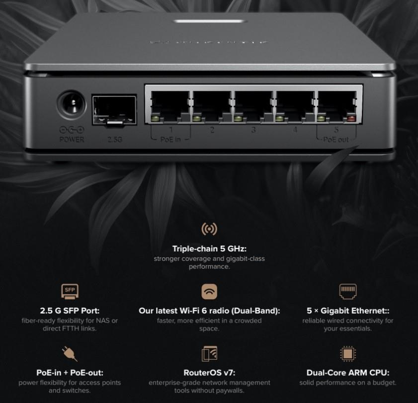 hAP ax S – nejvýhodnějším přístupový bod Mikrotiku s Wi-Fi 6. Levnější než většina sériově vyráběných wifirouterů střední třídy a přitom nabízí mnohem větší flexibilitu.  Pod elegantním vnějším pláštěm se skrývá dvoujádrový procesor ARM, dvoupásmové Wi-Fi 6, USB, pět gigabitových ethernetových portů a 2,5 gigabitová SFP šachta. Můžete se připojit přímo k optickému kabelu nebo propojit vysokorychlostní NAS pro bleskurychlý místní přístup.  Triple-chain 5GHz: klíč ke stabilnímu Wi-Fi v gigabitové třídě Nový hAP ax S je vybaven triple-chain 5GHz rádiem, které dosahuje reálné propustnosti kolem 800–900 Mbit/s. To znamená plynulé streamování, rychlejší stahování a stabilní výkon na více zařízeních.  Je také ideální jako specializovaný přístupový bod Wi-Fi 6 VR pro streamování pro PC VR headsety, který nabízí vyšší rozlišení a nižší latenci bez kabelů. Na rozdíl od jednoúčelových „herních“ přístupových bodů vám hAP ax S nabízí plný výkon, flexibilitu a funkční budoucnost v stále zdokonalovaném RouterOS v7.  Flexibilní napájení AP skýtá dvě možnosti napájení – přes DC konektor nebo PoE-in – dále integrován pasivní port PoE-out. PoE-out port využijete pro napájení dalšího zařízení MikroTik, jako je například další AP nebo kompaktní stolní switch.  Vaše síť, Vaše pravidla Navzdory nízké ceně běží hAP ax S na plné verzi RouterOS v7, nejflexibilnějším síťovém softwaru na trhu. V době rostoucích výzev v oblasti zabezpečení dat a ochrany soukromí vám RouterOS poskytuje úplnou kontrolu – bez předplatného, bez upsellů, bez uzamčených funkcí. Ať už konfigurujete svou první Wi-Fi síť prostřednictvím aplikace MikroTik nebo budujete složité topologie, RouterOS v7 roste s vámi.  VLAN, firewally, VPN tunely, tvarování provozu, skriptování, automatizace SMS – možnosti jsou neomezené. Například: můžete snadno izolovat zařízení IoT do samostatných podsítí, abyste ochránili svou domácí síť před nechtěným přístupem přes smart spotřebiče.  Dodáváno s napájecím adaptérem 24V 1.5A v produktovém balení.  Technické specifikace: Product code: E62iUGS-2axD5axT CPU: Dual-Core EN7562CT 950 MHz CPU architecture: ARM 32bit Size of RAM: 512 MB RAM type: DDR3 Storage: 128 MB NAND Number of 1G Ethernet ports: 5 Number of 1G SFP ports: 1 (2.5G supported) USB slot: 1 USB type A Switch chip model: EN7562CT Wireless: 2.4 GHz, 5 GHz Protocols: 802.11b/g/n/ax, 802.11a/n/ac/ax Wireless interface model: MT7916 MT7976 Number of chains: 2,4GHz - 2, 5GHz - 3 Antenna gain: 2,4GHz - 5.5dBi, 5GHz - 8dBi Dimensions: 156 x 127 x 36 mm Operating system: RouterOS v7, License level 4 Operating temperature: -40°C to +70°C  Napájení Number of DC inputs: 2 (DC jack, PoE-In) DC jack input Voltage: 12-28 V PoE-In input voltage: 18-28 V Power adapter nominal voltage: 24 V Power adapter nominal current: 1.5 A PoE-In: Passive PoE PoE-Out: Passive PoE PoE-out ports: Ether5 Max out per port output (input < 30 V): 0.6 A Total output power: 16.8 W Max power consumption (without attachments): 11 W Max power consumption: 34 W  Upozornění: Výrobce Mikrotik neposkytuje záruku na zařízení poškozená přepětím. Zařízení je třeba adekvátně chránit proti indukovanému elektrostatickému přepětí či přepěťovým špičkám na silovém vedení. Pro venkovní instalace používat výhradně stíněnou kabeláž (FTP/SFTP) a jednotky korektně uzemnit (prostřednictvím integrovaného zemnícího členu či použitím ethernetové přepěťové ochrany).  Zařízení vždy provozujte s poslední výrobcem publikovanou verzí (výrobcem označenou "Stable") operačního systému RouterOS. Taková verze garantuje nejoptimálnější funčknost, obsahuje opravené chyby z verzí předchozích a výkonová vylepšení..