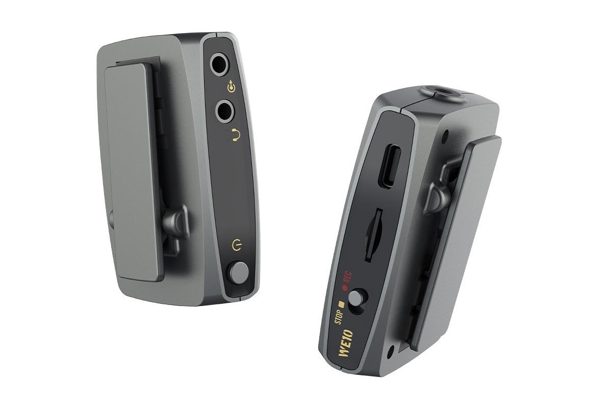 Vysielač v sade WE10 je vybavený vysoko výkonným všesmeryovým mikrofonom. K dispozícii je aj malý externý klopový mikrofón, ktorý ľahko pripojíte k vysielaču pomocou 3,5 mm jack konektora a ponúka tak väčšiu voľnosť pri nahrávaní. Na zadnej strane vysielača je svorka, vďaka ktorej ho môžete ľahko pripnúť napríklad na klopu, nohavice alebo opasok. Prijímač jednoducho upevníte na hornú časť fotoaparátu do kolébky blesku alebo ho pripojíte na iné zvolené nahrávacie zariadenie (kamera, počítač, audio rekordér atď.). Vybrané zariadenie prepojíte pomocou 3,5 mm jack konektora a priloženého audio kábla.