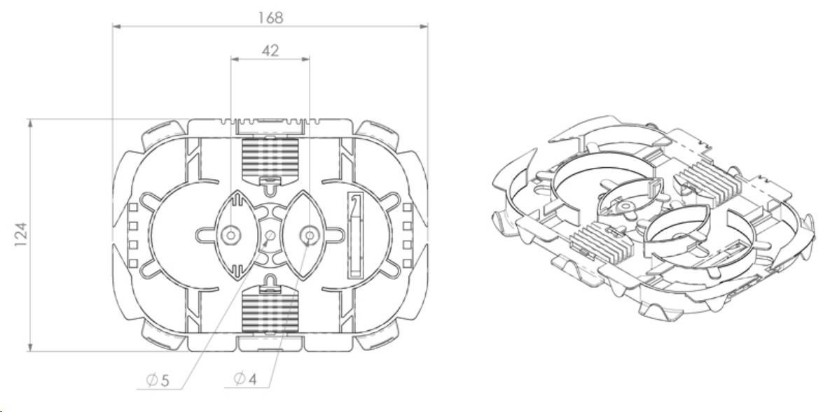 - dva hrebene s celkovou kapacitou 24 chráničov zvarov. (Uloženie a konštrukcia výklopných hrebeňov umožňuje viesť vlákna aj pod nimi