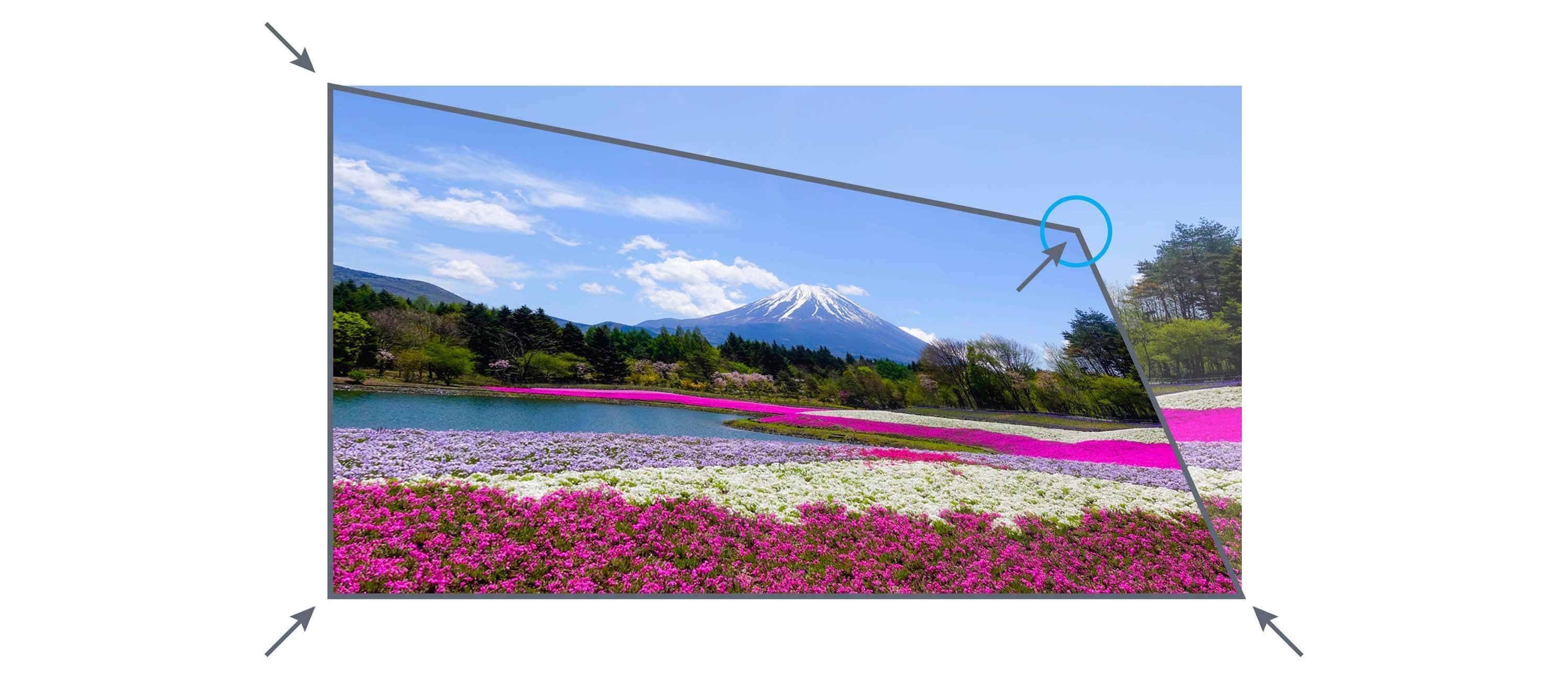 Upravte lichoběžníkové zkreslení ve vertikální i horizontální rovině. Každý roh obrazu můžete individuálně přizpůsobit tak, abyste dosáhli dokonale pravoúhlého tvaru. Ideální pro skládání obrazu, promítání na nerovné stěny nebo pro situace, kdy je umístění projektoru komplikované a přístroj musí být nainstalován pod úhlem.