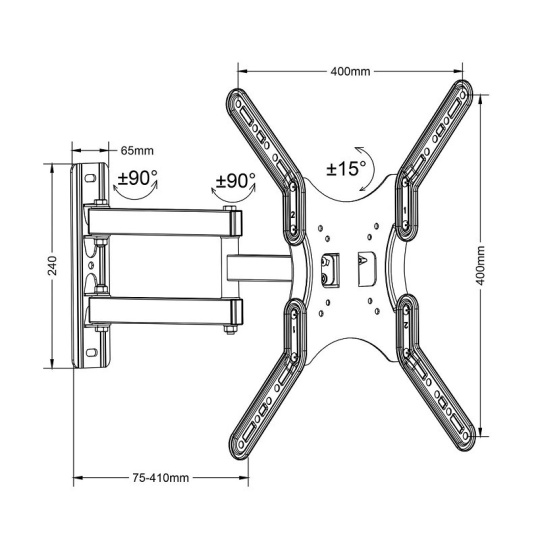 Otočný držiak na televízor Fiber Mounts M7C59 Oceľový držiak na televízor alebo monitor 15-55", otočný do strán +/-90°, naklápanie +/-15°, nastaviteľná vzdialenosť od steny 75-410mm, VESA 75x75 až 400x400, nosnosť 30kg, inštalačný materiál Kvalitný nástenný držiak na zavesenie televízorov alebo monitorov s uhlopriečkou 15" až 55". Obrazovkou je možné po inštalácii na držiak otáčať na obe strany až o +/-90°, nakláňať ju nahor alebo nadol až o +/-15° a kedykoľvek meniť vzdialenosť od steny od 75mm až do 410mm. Držiak je vhodný aj na zavesenie televízora alebo monitoru do rohov miestností, na piliere alebo stĺpiky, do pripravených výklenkov a pod. Podporuje VESA štandardy od 75x75 do 400x400 a unesie zaťaženie 30kg. V balení nájdete inštalačný materiál. Farebné prevedenie čierne, záruka 5 rokov. Otočný a sklopný držiak na televízie a monitory Fiber Mounts M7C59 Technické údaje: nosnosť 30kg podporuje VESA štandardy 75x75 až 400x400 na televízie alebo monitory s uhlopriečkou 15" až 55" otáčanie do strán až +/- 90° naklápanie až +/- 15° nastavenie vzdialenosti od steny 75mm až 410mm inštalačná plocha 240 x 65mm kvalitná oceľová konštrukcia balenie obsahuje inštalačný materiál farebné prevedenie čierne záruka 5 rokov Nástenný držiak na TV monitor Fiber Mounts M7C59 vyniká svojou kvalitnou oceľovou konštrukciou Držiak na TV a monitory Fiber Mounts M7C59 podporuje VESA štandardy: VESA 75x75 VESA 100x100 VESA 200x100 VESA 200x200 VESA 300x300 VESA 400x200 VESA 400x400 Na držiaky M7C59 môžete zavesiť ľubovoľné televízory a monitory, ktoré podporujú ktorýkoľvek z vyššie uvedených VESA štandardov a ktorých hmotnosť nie je vyššia ako 30kg.