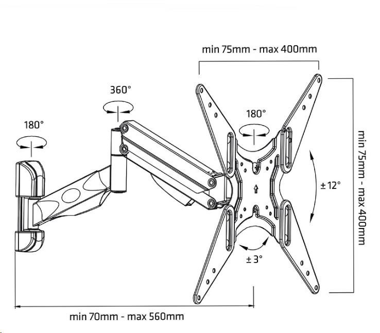 Otočný, sklopný, dĺžkovo a výškovo nastaviteľný držiak TV Fiber Mounts AX784 Plne nastaviteľný, kvalitný držiak na TV 32-60" s hmotnosťou do 22kg Kvalitný, plne nastaviteľný, dizajnový držiak na LCD, LED, OLED, 3D, Full HD televízory s hmotnosťou až 22kg. Optimálna uhlopriečka televízora 32-60". Držiak je vhodný na zavesenie televízora na stenu, do výklenku, na pilier alebo stĺpik, rovnako tak je vhodný aj na umiestnenie televízora do rohov miestností. Plná nastaviteľnosť vám umožní ľahko polohovať televízor presne podľa vašich potrieb a požiadaviek. Držiak TV vás milo poteší nielen svojou kvalitou, ale aj veľmi pekným dizajnom a jednoduchou polohovateľnosťou. Dodávame vrátane inštalačného materiálu, farebné prevedenie čierne. Otočný, sklopný, dĺžkovo a výškovo nastaviteľný držiak na LCD LED OLED 3D Smart televízie aj monitory s hmotnosťou do 22kg. Držiak je vhodný na zavesenie televízora na stenu alebo do rohu miestnosti, do výklenku alebo na pilier, stĺpik. Držiak Fiber Mounts AX784 Technické údaje: pre televízory s hmotnosťou 9kg až 22kg na televízie a monitory s uhlopriečkou 32-60" podpora VESA 75x75 až 400x400 otáčanie do strán +/- 90° náklon +/- 12° úprava dĺžky od steny 70mm až 560mm úprava roviny obrazovky +/- 3° úchytky na vedenie káblov veľmi pekný vzhľad ľahké nastavenie TV do požadovanej polohy výborná kvalita farebné prevedenie čierne záruka 2 roky Držiak Fiber Mounts AX784 podporuje VESA štandardy (VESA normy): VESA 75x75 VESA 100x100 VESA 200x100 VESA 200x200 VESA 300x300 VESA 400x200 VESA 400x400