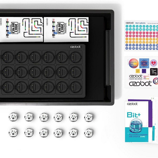 Tato sada pro školy a zájmové kroužky je vybavená vším, co potřebují velké týmy, aby se do zábavného kódování mohly hned pustit. Vedle 12 Ozobotů Bit+ v ní najdete i soubor aktivit, které vám pomohou do tajů programování hladce proniknout. Nechybí ani set 12 omyvatelných fix, které dětem usnadní do kreslení barevných kódů a vlastních spletitých drah. Šířka stopy popisovačů je přizpůsobená přímo senzorům malého bota. Ten se tak lépe orientuje na jejich trasách a nevyžaduje tak častou kalibraci. Radost malým programátorům určitě udělá i množství barevných samolepek. Novinkou je pak nabíjecí matrice, která se postará i o automatickou aktualizaci softwaru. Má nízký profil a skromné rozměry, aby nikdy nepřekážela. Součástí balení je AC/DC adaptér pro zapojení nabíjecí stanice do standardní elektrické zásuvky.