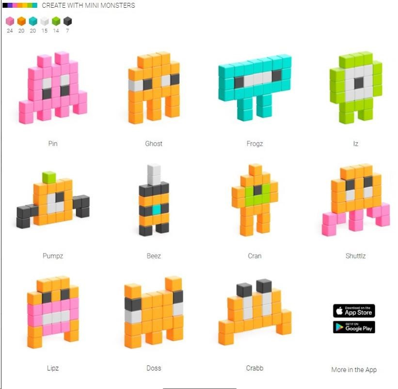 Rad PIXIO Mini Monsters obsahuje 100 PIXIO blokov v 6 farbách. Oživte svoj tvorivý život