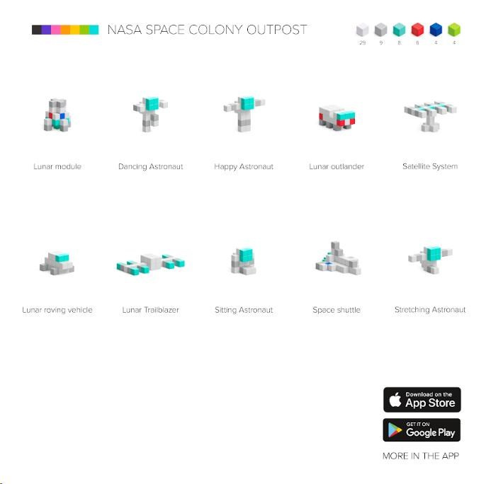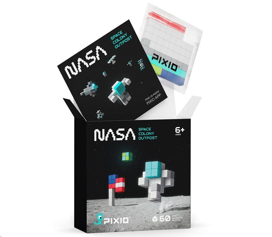 Stavebnica PIXIO 31102 NASA Space Colony Outpost (Koloniálna základňa) obsahuje 60 kociek PIXIO v 5 farbách. Umožnia oživiť vaše kreatívne nápady a prinesú farebnú radosť do života. Začnite stavbou jednoduchých modelov podľa pokynov a potom, až budete pripravení, prejdite k vytváraniu vlastných návrhov. S touto sadou si môžete postaviť astronautov, raketoplán, lunárny modul, lunárne vozidlo, satelitný systém, rover a mnoho ďalších. Pixio je splnený sen fanúšikov Pixel Artu, hráčov Minecraftu a všetkých, ktorí sa radi hrajú. Použite ho ako učebný zdroj na rozvoj detskej kreativity. Obsahuje 5 farieb, ktoré vám pomôžu premeniť jednoduché tvary na skvelé objekty a postavy (biela 29x, sivá 9x, svetlomodrá 8x, červená 6x, modrá 4x, svetlozelená 1x).