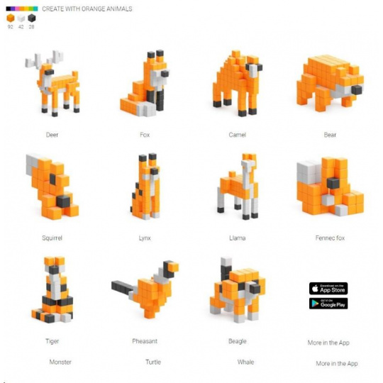 PIXIO ORANGE ANIMALS DESIGN SERIES obsahuje 162 PIXIO blokov v 3 farbách. Umožňuje vám oživiť vaše