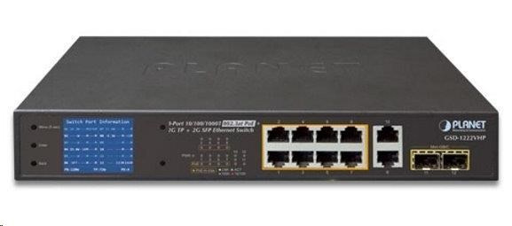 Planet GSD-1222VHP Switch, 8x PoE + 2x 1000Base-T + 2x SFP, LCD,VLAN, extend mód 10Mb do 250m, IEEE 802.3at 120W