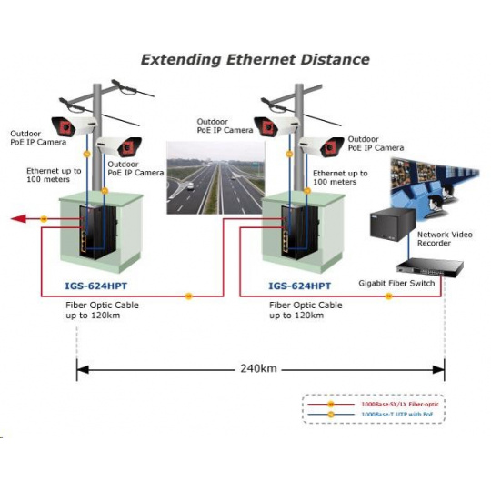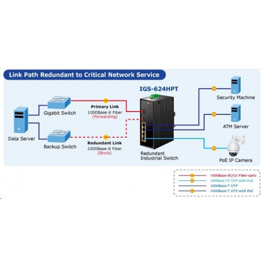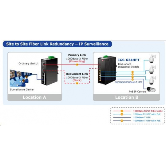 Planet IGS-624HPT, PoE switch 4x 1000Base-T, 2x SFP 100/1000Base-X, 802.3at 120W, DIN, IP30, -40 až +75st.C Priemyselné ethernetové prepínače sú určené do náročných prevádzkových podmienok so širokým rozsahom prevádzkových teplôt, neistým napájaním a častými otrasmi. Verzie série spínačov s rozšíreným teplotným rozsahom. Prepínače radu IGS sa ľahko inštalujú na štandardnú lištu DIN alebo priamo na stenu a umožňujú nasadenie známej technológie Ethernet aj v priemyselnom prostredí. Sú vhodné aj na inštaláciu vo vonkajších krytoch s veľkými výkyvmi prevádzkových teplôt (typicky bezdrôtové aplikácie a aplikácie MAN ISP). Ako prepínač PoE môže priamo napájať až 4 zariadenia IEEE 802.3at, a preto je ideálny pre aplikácie so zníženou dostupnosťou energie. Vlastnosti: - 4x 1000Base-T, prepínanie, plný duplex (1000/2000 Mb/s), automatické vyjednávanie (10/100/1000 Mb/s), automatická detekcia priameho/krosového kábla na každom porte - PoE IEEE 802.3at injektory so zaťažiteľnosťou 30 W/port, celkovo až 120 W - 2x SFP 100-FX / 1000Base-X na inštaláciu mini-GBIC modulov, zdieľané porty s 5 a 6 TP portmi - priepustnosť: zbernica 12 Gb/s, prevádzkovo 8.93Mp/s(64Bajtov) - 1k MAC adries, MTU max. 9216Bajtů - DIP přepínače pro nastavení práce portů, LED indikátory stavu provozu - instalace na DIN lištu, montážní díl součástí - instalace na zeď, montážní díl součástí - krytí IP30 - napájení: 48V DC redundantní, připojení možné ze dvou různých zdrojů (nejsou součástí balení); vlastní příkon do 15W - ochrana proti přepólování, připojení napájení na svorkovnici, umístění na spodním panelu (nepřekáží při montáži na zeď) - přepěťová ochrana napájení do 6kV proti napěťovým špičkám (EFT) - přepěťová ochrana LAN portů proti elektrostatickému náboji do 6kV (ESD) - zařízení je odolné proti pádu (IEC-60068-2-32) z výšky 75cm na všechny dopadové části - zařízení je odolné proti vibracím (IEC-60068-2-6) 10-500-10Hz, 4x g, 0,5oct/min - zařízení je odolné proti přetížení krátkodobému zrychlení 50g, dlouhodobému 4g, (IEC-60068-2-27) - EMI/EMS, elektromagnetická kompatibilita a slučitelnost dle CE EN-6100-4-2,3.