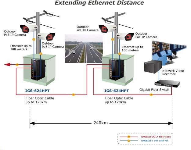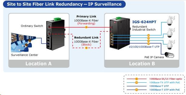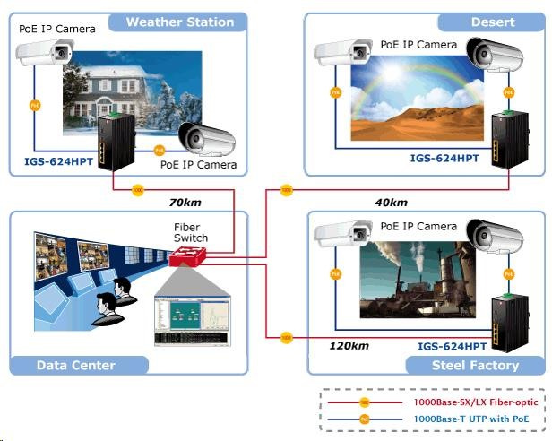 Planet IGS-624HPT, PoE switch 4x 1000Base-T, 2x SFP 100/1000Base-X, 802.3at 120W, DIN, IP30, -40 až +75st.C Priemyselné ethernetové prepínače sú určené do náročných prevádzkových podmienok so širokým rozsahom prevádzkových teplôt, neistým napájaním a častými otrasmi. Verzie série spínačov s rozšíreným teplotným rozsahom. Prepínače radu IGS sa ľahko inštalujú na štandardnú lištu DIN alebo priamo na stenu a umožňujú nasadenie známej technológie Ethernet aj v priemyselnom prostredí. Sú vhodné aj na inštaláciu vo vonkajších krytoch s veľkými výkyvmi prevádzkových teplôt (typicky bezdrôtové aplikácie a aplikácie MAN ISP). Ako prepínač PoE môže priamo napájať až 4 zariadenia IEEE 802.3at, a preto je ideálny pre aplikácie so zníženou dostupnosťou energie. Vlastnosti: - 4x 1000Base-T, prepínanie, plný duplex (1000/2000 Mb/s), automatické vyjednávanie (10/100/1000 Mb/s), automatická detekcia priameho/krosového kábla na každom porte - PoE IEEE 802.3at injektory so zaťažiteľnosťou 30 W/port, celkovo až 120 W - 2x SFP 100-FX / 1000Base-X na inštaláciu mini-GBIC modulov, zdieľané porty s 5 a 6 TP portmi - priepustnosť: zbernica 12 Gb/s, prevádzkovo 8.93Mp/s(64Bajtov) - 1k MAC adries, MTU max. 9216Bajtů - DIP přepínače pro nastavení práce portů, LED indikátory stavu provozu - instalace na DIN lištu, montážní díl součástí - instalace na zeď, montážní díl součástí - krytí IP30 - napájení: 48V DC redundantní, připojení možné ze dvou různých zdrojů (nejsou součástí balení); vlastní příkon do 15W - ochrana proti přepólování, připojení napájení na svorkovnici, umístění na spodním panelu (nepřekáží při montáži na zeď) - přepěťová ochrana napájení do 6kV proti napěťovým špičkám (EFT) - přepěťová ochrana LAN portů proti elektrostatickému náboji do 6kV (ESD) - zařízení je odolné proti pádu (IEC-60068-2-32) z výšky 75cm na všechny dopadové části - zařízení je odolné proti vibracím (IEC-60068-2-6) 10-500-10Hz, 4x g, 0,5oct/min - zařízení je odolné proti přetížení krátkodobému zrychlení 50g, dlouhodobému 4g, (IEC-60068-2-27) - EMI/EMS, elektromagnetická kompatibilita a slučitelnost dle CE EN-6100-4-2,3.