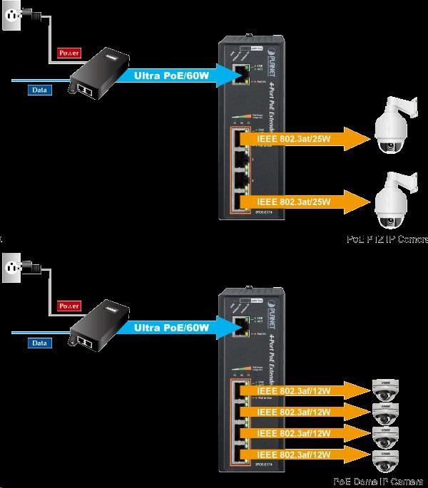 Priemyselný extender Power over Ethernet IEEE 802.3at so 4-portovým gigabitovým prepínačom a injektormi na dodatočné napájanie zariadení cez Ethernet. Injektory je možné zaťažovať až do 60 W v kombinácii 2x 802.3at s výkonom 30 W alebo 4x 802.3af pri 12 W. Určené na použitie s kamerami PTZ, dotykovými monitormi, zariadeniami VoIP alebo prístupovými bodmi WiFi v teréne a na ťažko prístupných miestach. Extender je možné prevádzkovať pri teplotách od -40 do 75 °C a je odolný voči vibráciám, preťaženiu a vonkajším mechanickým vplyvom; všetky porty obsahujú ochranu ESD+EFT proti prepätiu a elektrostatike. Extender je napájaný priamo z injektora PoE UltraPower (60 W) Planet POE-171 alebo POE-173! Parametre: - ethernetové rozhranie: 1x vstup PoE (Ultra Power 60W); 4x injektory - celková zaťažiteľnosť injektorov 60W (2x 30W alebo 4x 12W) - kompatibilné s IEEE 802.3u, IEEE 802.3ab 1000Base-T, IEEE 802.3af, IEEE 802.3at - instalace na DIN lištu nebo na zeď, montážní díl součástí - krytí IP30, skříň celohliníková - zařízení je odolné proti pádu (IEC-60068-2-32) z výšky 75cm na všechny dopadové části - zařízení je odolné proti vibracím (IEC-60068-2-6) 10-500-10Hz, 4x g, 0,5oct/min - zařízení je odolné proti přetížení krátkodobému zrychlení 50x g, dlouhodobému 4x g (IEC-60068-2-27) - integrována ochrana EFT/ESD proti zavlečení cizího napětí a proti rychlým přechodovým jevům do 6KV DC - EMI/EMS, elektromagnetická kompatibilita a slučitelnost dle CE EN-6100-4-2,3,4,5,6 - elektrická bezpečnost dle CE EN-60950 - LED indikace zatížení - pracovní teplota -40 až 75°C, vlhkost do 95% - rozměry: 135 x 87.8 x 56 mm - hmotnosť 715 g - napájanie PoE IEEE 802.3at, 60W injektor UltraPower (Planet POE-171 alebo POE-173)..