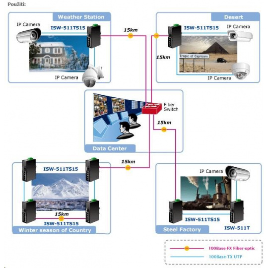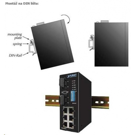 Planet ISW-511T, 4x 10/100Base-TX+ 1x 100FX 2km, MM, DIN, IP30, -40~75°C Priemyselné ethernetové prepínače sú určené do náročných prevádzkových podmienok so širokým rozsahom prevádzkových teplôt, neistým napájaním a častými otrasmi. Prepínače radu ISW sa ľahko inštalujú na štandardnú lištu DIN alebo priamo na stenu a umožňujú nasadenie známej technológie Ethernet aj v priemyselnom prostredí. Sú vhodné aj na inštaláciu vo vonkajších krytoch s veľkými výkyvmi prevádzkových teplôt (typicky bezdrôtové aplikácie a aplikácie MAN ISP). Vlastnosti: - 4 porty 100Base-TX, prepínanie, plný duplex (100/200 Mb/s), automatické vyjednávanie (10/100 Mb/s), automatická detekcia priameho/krosového kábla na každom porte - 1 port 100Base-FX, plný duplex, konektory SC, multimodemový, pre vlákna 50/125um a 62,5/125um, dosah 2 km, vlnová dĺžka 1300 nm, zdvih min. 15,5 dB (vysielací výkon max. -14dBm, min. -19dBm, citlivosť príjmu -34,5dBm) - 1M vyrovnávacia pamäť, priepustnosť zbernice 1Gbps, 0,74Mpps (64B), tabuľka 2k MAC adries - sústava LED indikátorov pre diagnostiku prevádzky - montáž na DIN lištu, montážny diel je súčasťou dodávky - montáž na stenu, montážny diel je súčasťou dodávky - krytie IP30, celohliníkový kryt - napájanie: 12-48V DC redundantné, možnosť pripojenia z dvoch rôznych zdrojov (nie sú súčasťou dodávky) - ochrana proti prepólovaniu, pripojenie napájania na svorkovnici, umiestnenie na spodnom paneli (neprekáža pri montáži na stenu) - prioritizácia prevádzky QoS podľa portov, ToS, 802.1p - zariadenie je odolné voči pádu (IEC-60068-2-32) z výšky 75 cm na všetky nárazové časti - zariadenie je odolné voči vibráciám (IEC-60068-2-6) 10-500-10Hz, 4xg, 0,5okt/min - zariadenie je odolné voči preťaženiu krátkodobé zrýchlenie 50g, dlhodobé 4g, (IEC-60068-2-27) - EMI/EMS, elektromagnetická kompatibilita a kompatibilita podľa CE EN-6100-4-2,3,4,5,6 - elektrická bezpečnosť podľa CE EN-60950 - pracovná teplota -40 až 75°C, vlhkosť do 95% - spotreba energie do 14W - rozmery: 135 x 97 x 32 mm - hmotnosť: 436g..