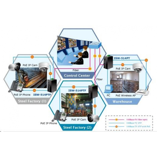 Prepínač planét ISW-514PTF, priemysel.verzia 4x10/100+1x100BaseFX (SFP), DIN, IP30, -40 až 70°C, 12-48V Priemyselné ethernetové prepínače sú určené do náročných prevádzkových podmienok so širokým rozsahom prevádzkových teplôt, neistým napájaním a častými otrasmi. Prepínače radu ISW sa ľahko inštalujú na štandardnú lištu DIN alebo priamo na stenu a umožňujú nasadenie známej technológie Ethernet aj v priemyselnom prostredí. Sú vhodné aj na inštaláciu vo vonkajších krytoch s veľkými výkyvmi prevádzkových teplôt (typicky bezdrôtové aplikácie a aplikácie MAN ISP alebo kamerové systémy). Verzia s POE IEEE 802.3af umožňuje priamo napájať až 4 koncové zariadenia, takže je ideálny pre aplikácie so zníženým výkonom koncových zariadení! Vlastnosti: 4 porty 10/100 Base-TX, prepínanie, plný duplex (100/200 Mb/s), automatické vyjednávanie (10/100 Mb/s) na všetkých PoE IEEE 802.3af injektory se zatížitelností 15,4W/port, celkově až 60W 1x 100FX, SFP slot pro instalaci modulů MFB-TFX nebo MFB-TF20 2k MAC adres automatická detekce přímý/křížený kabel na každém portu pole LED indikátorů pro diagnostiku provozu instalace na DIN lištu, montážní díl součástí instalace na zeď, montážní díl součástí krytí IP30, skříň celohliníková napájení: 24/48V DC redundantní, připojení možné ze dvou různých zdrojů (nejsou součástí balení) ochrana proti přepólování, připojení napájení na svorkovnici, umístění na spodním panelu (nepřekáží při montáži na zeď) alarmový výstup aktivovaný při výpadku napájení zařízení je odolné proti pádu (IEC-60068-2-32) z výšky 75cm na všechny dopadové části zařízení je odolné proti vibracím (IEC-60068-2-6) 10-500-10Hz, 4x g, 0,5oct/min zařízení je odolné proti přetížení krátkodobému zrychlení 50x g, dlouhodobému 4x g (IEC-60068-2-27) EMI/EMS, elektromagnetická komp C, vlhkosť do 90 % hmotnosť: 842 g rozmery: 135 x 87.8 x 56 mm..