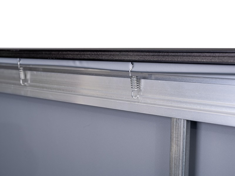 Rám plátna je potiahnutý čiernym semišom na pohlcovanie okolitého svetla a zvýraznenie projekčných farieb.