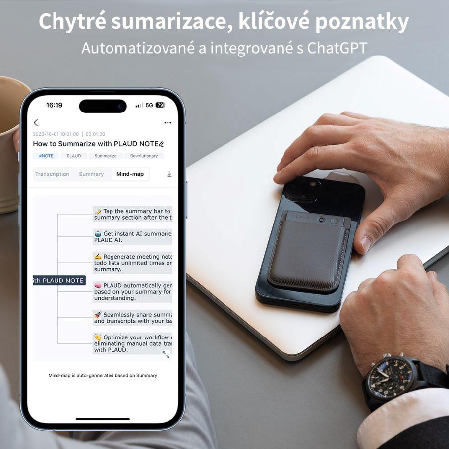 Plaud Note je AI hlasový záznamník, ktorý vám s pomocou ChatGPT nástrojov podstatne uľahčí život. Záznamník má minimalistický dizajn ocenený cenou Red Dot za výnimočný dizajn a minimalistické sú aj jeho rozmery – je veľký ako platobná karta. Záznamník podporuje 57 jazykov vrátane češtiny a slovenčiny. Plaud Note ponúka duálny režim nahrávania, a to pre diktovanie poznámok a druhý pre nahrávanie hovorov. Vďaka vestavanej 64GB úložnej pamäti môžete na Plaud Note nahrávať až 480 hodín záznamu a jeho energetická nenáročnosť zabezpečí 30 hodín kontinuálneho záznamu a 60 dní pohotovostného režimu. Absolútne výnimočné je u osobných záznamníkov prepojenie Plaud Note s ChatGPT. Vďaka aplikácii Plaud môžete nechať nadiktované záznamy prepísať, tvoriť z nich shrnutia, a dokonca nechať AI vytvoriť, dnes veľmi populárne, myšlienkové mapy. V cene produktu je navyše zahrnuté cloudové úložisko pre 10 000 minút záznamu. Služba PLAUD AI Membership má dve varianty. Starter a Pro. Starter ponúka takmer všetky funkcie, obsahuje 300 minút transkripcie záznamu a je zadarmo. Verzia Pro ponúka 1200 minút prepisu, rozšírený výber šablón, a navyše prioritný prístup k chystaným funkciám ako je napríklad rozpoznávanie osoby alebo prekladač. Aktuálna cena služby pre je 249 Kč mesačne* pri mesačnom účtovaní, alebo 1990 Kč ročne*. Ďalšie z bezplatných funkcií, ktoré robia spoluprácu s Plaud Note je AI spracovanie, zabezpečujúce elimináciu ruchu na pozadí. Túto funkciu je možné aktivovať aj dodatočne, po vytvorení záznamu a dajú sa ju nastaviť v troch intenzitách pre každú príležitosť. Poznámky tak môžete v pokoji diktovať aj na rušnej ulici a výsledkom bude len váš, izolovaný hlas. Záznamník sa ovláda fyzickým tlačidlom s haptickou odozvou a fyzickým prepínačom režimov. Záznam začína aj končí jediným stlačením tlačidla, tak jednoduché to je. (*cena predplatného aktuálna 20.5.2024)