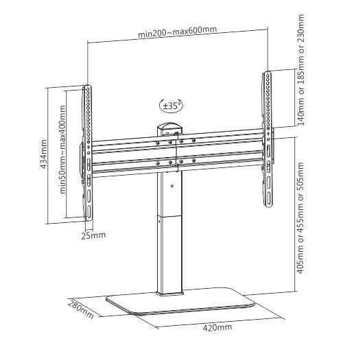 Podstava na televíziu Fiber FM05 Na televíziu 37-70", nastaviteľná výška 405-735mm, otáčanie do strán +/- 35°, sklenená podstava 420x280x8mm, VESA štandardy 200x100 až 600x400, nosnosť 40kg Kvalitná veľmi pekná podstava na televíziu s uhlopriečkou 37" až 70", ktorá Vám umožní s televíziou otáčať na obe strany až o 35°. Podstava má nastaviteľnú výšku v 6 polohách - 3 polohy na nosníku a 3 polohy na ramene držiaku od 405mm do 735mm. Podporuje veľkosti VESA štandardov od 200x100 do 600x400, Dolná polica je z tvrdeného skla o hrúbke 8mm a rozmeroch 420x280mm. Farebné prevedenie čierne, balenie obsahuje inštalačnú sadu. Záruka 5 rokov. TV podstavec s otáčaním do strán a nastaviteľnou výškou Fiber FM05 Technické údaje: nosnosť 40kg na televízie s uhlopriečkou 37" až 70" podporuje VESA štandardy 200x100 až 600x400 nastaviteľná výška 405, 455, 505, 645, 690 a 735mm otáčanie televízie na obe strany +/- 35° úchyty na kábláž podstava z tvrdeného skla s rozmermi 420x280x8mm dizajnové prevedenie vynikajúca kvalita farebné prevedenie čierne záruka 5 rokov Kvalitný dizajnový podstavec na televíziu Fiber FM05 Držiak na podstavci Fiber FM05 podporuje VESA štandardy: VESA 200x100 VESA 200x200 VESA 300x200 a 200x300 VESA 300x300 VESA 400x200 a 200x400 VESA 400x300 a 300x400 VESA 400x400 VESA 600x400