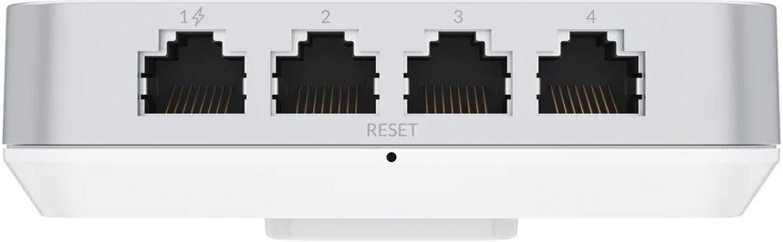 Okrem gigabitového portu na zadnej strane má na spodnej strane aj ďalšie 4 gigabitové porty, kde je možné použiť funkciu PoE passthough na prvom z týchto portov.