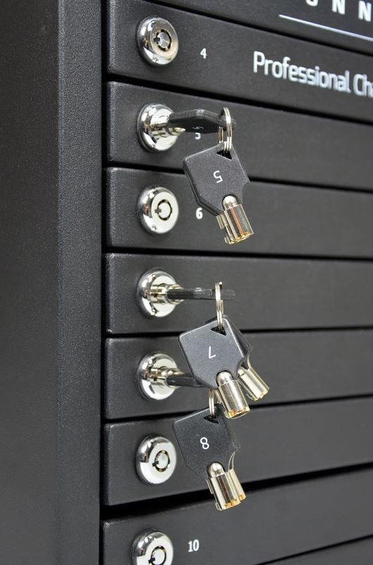 Originálna napájacia skrinka s funkciou dobíjania a individuálnych zámkov pre každé zariadenie zvlášť.