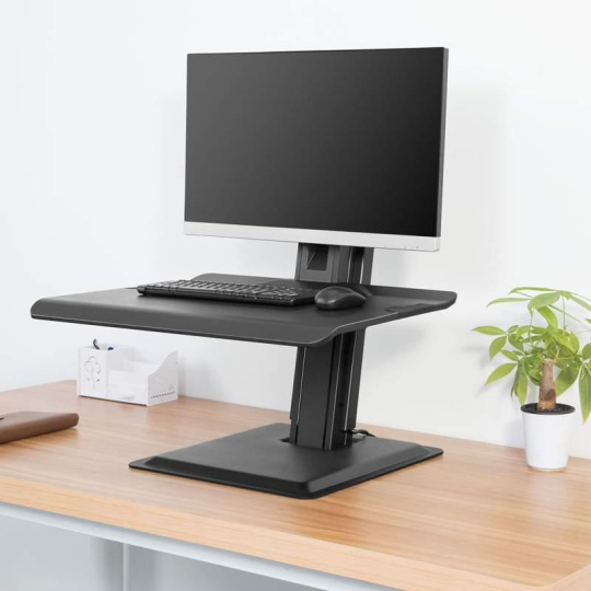 Pracovná stanica NB ST15B Ergonomická pracovná stanica - stolový stojan na monitor 19-32", s policou na klávesnicu a myš, výškovo nastaviteľná pre prácu v stoji alebo v sede, úprava výšky, sklonu a rotácie monitora, VESA 75x75 a 100x100, nosnosť 11kg Profesionálna pracovná stanica pre moderné kancelárie - rýchla a jednoduchá zmena polohy pre prácu v sede alebo v stoji vďaka pokročilému systému zmeny výšky. Stojan podporuje VESA štandardy 75x75 a 100x100, umožní Vám rýchlu zmenu výšky +/- 45cm. Nastavenie polohy samotného monitora: úprava výšky od police +/- 11cm, náklon +3°/-15°, horizontálne alebo vertikálne otočenie. Nosnosť 11kg. Profesionálna konštrukcia, estetický dizajn, luxusné čierne prevedenie. Systém na vedenie káblov. Záruka 5 rokov. Pracovná stanica na jednoduchú zmenu polohy monitora a klávesnice s myšou pre prácu v sede alebo v stoji, najvyššia kvalita, top dizajn - Fiber Mounts ST15B Technické údaje: nosnosť 11kg na monitory s uhlopriečkou 19-32" podpora VESA štandardov 75x75 a 100x100 rýchle nastavenie výšky pre prácu v sede alebo v stoji +/- 45cm pokročilý systém výškovej polohy - ľahko, rýchlo, bez náradia výškové polohovanie samotného monitora 110mm polica na klávesnicu a myš s rozmermi 690x495mm základňa o rozmeroch 450x480mm (minimálny potrebný priestor na stole) nastavenie náklonu monitora +3° / -15° systém pre skryté vedenie káblov esteticky ukrytý USB port profesionálna pracovná stanica najvyššej kvality výnimočná stabilita krásny dizajn v čiernom prevedení záruka 5 rokov Stolová pracovná stanica do kancelárie pre prácu v sede alebo v stoji - Fiber Mounts ST15B Pracovná stanica NB ST15B podporuje VESA štandardy: VESA 75x75 VESA 100x100 Pracovná stanica, profesionálna, nastaviteľný výškový rozsah monitora od police na klávesnicu s myšou - Fiber Mounts ST15B Pracovná stanica pre prácu v stoji alebo v sede, výškovo polohovateľná 450mm - Fiber Mounts ST15B Nastavenie náklonu monitora na pracovnej stanici Fiber Mounts ST15B Pracovná stanica do kancelárie pre prácu v stoji alebo v sede, pokročilý systém výškovej polohy - Fiber Mounts ST15B Profesionálna stolová pracovná stanica pre pohodlnú prácu v sede alebo v stoji, rýchla a jednoduchá zmena požadovanej výšky. Znižuje bolesť chrbta a zvyšuje pracovný výkon a pohodlie. Krásny dizajn, ktorý si získa nielen Vás, ale úplne každého.