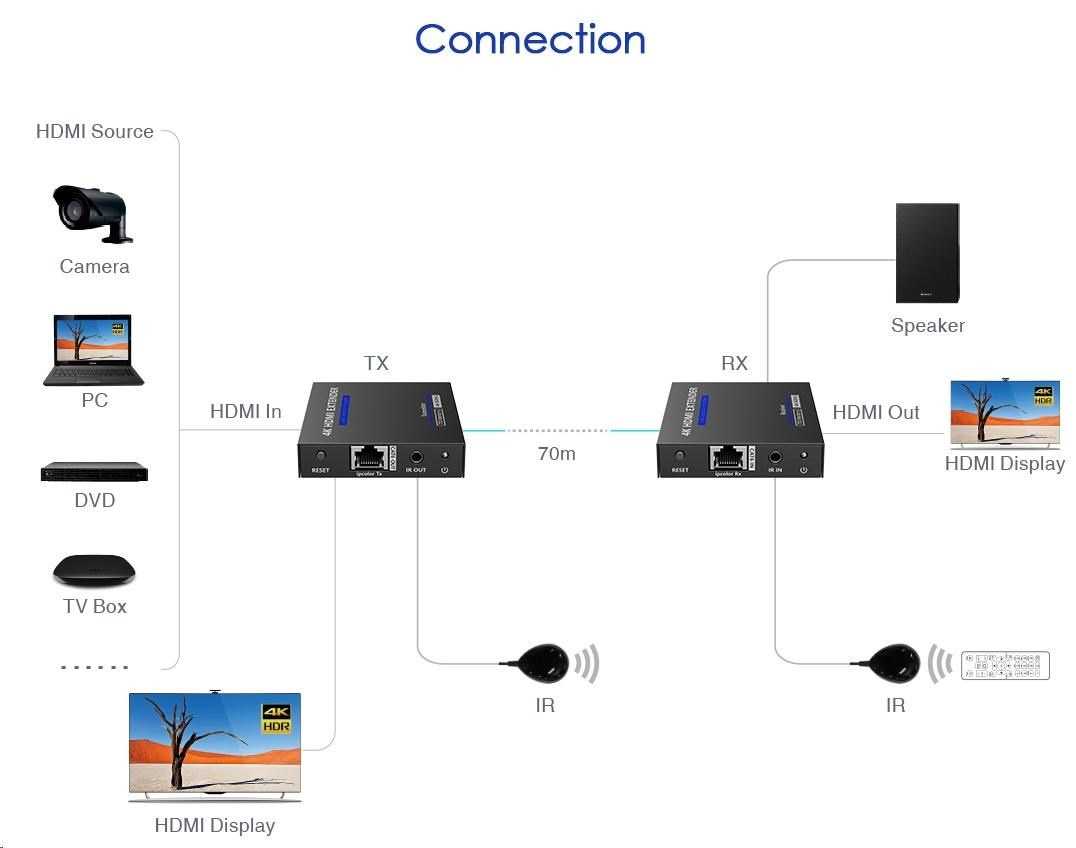 Toto zariadenie HDMI Extender umožňuje prenášať signál HDMI na veľké vzdialenosti pomocou sieťového kábla CAT6/6A/7.