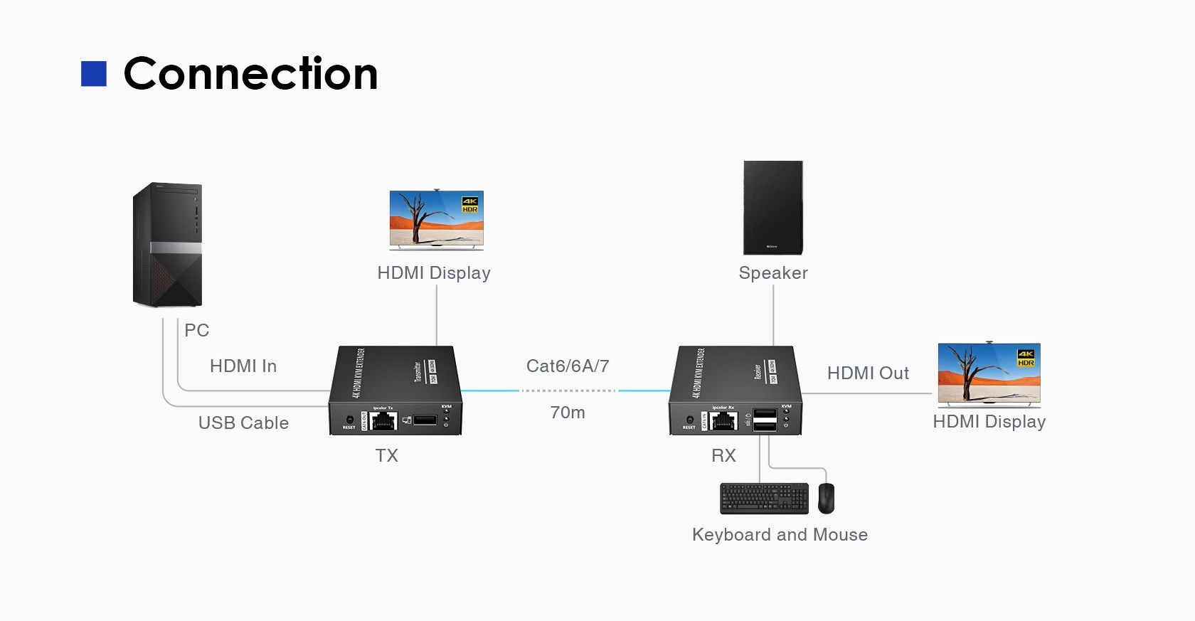Umožňuje distribuovať HDMI signál s vysokým rozlíšením 4K@60Hz bez zpoždenia až na 70 metrov a zároveň prenášať USB (napríklad klávesnicu, myš alebo iné USB periférie)