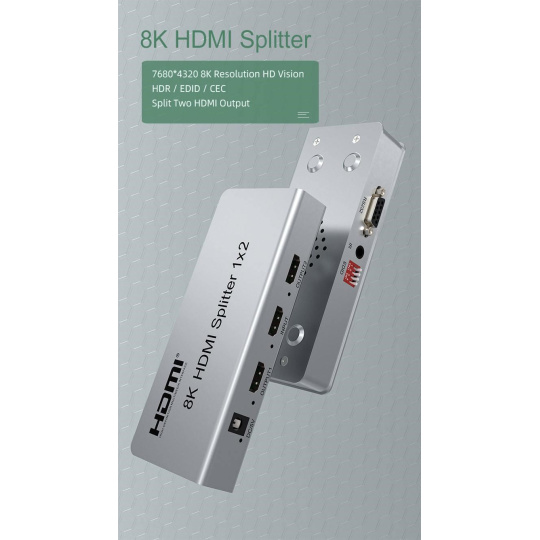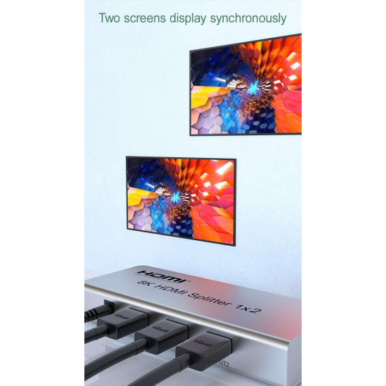 Splitter podporuje HDMI signál s rozlíšením až 8K@60Hz, 4K@120Hz alebo FULL HD 1080p