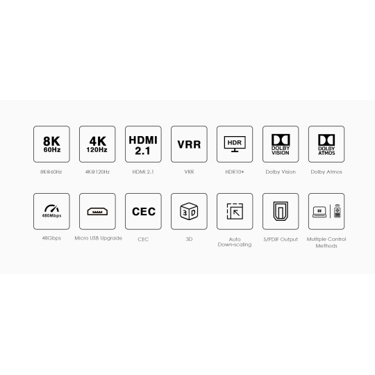 PremiumCord HDMI switch 4:1 s podporou rozlišení 8K@60Hz,4K@120Hz, 1080P, HDR, s dálkovým ovladačem