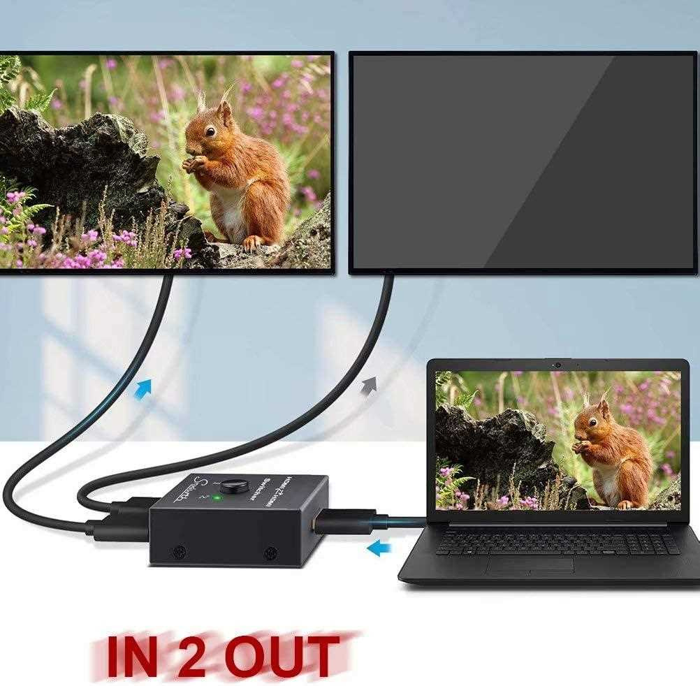 - Obousmerný 2x1 / 1x2 HDMI prepínač je možné použiť dvoma rôznymi spôsobmi: pripojiť 2 vstupné zdroje s 1 výstupným displejom alebo 1 vstupný zdroj so 2 displejmi (funguje iba na 1 obrazovke, nie súčasne).