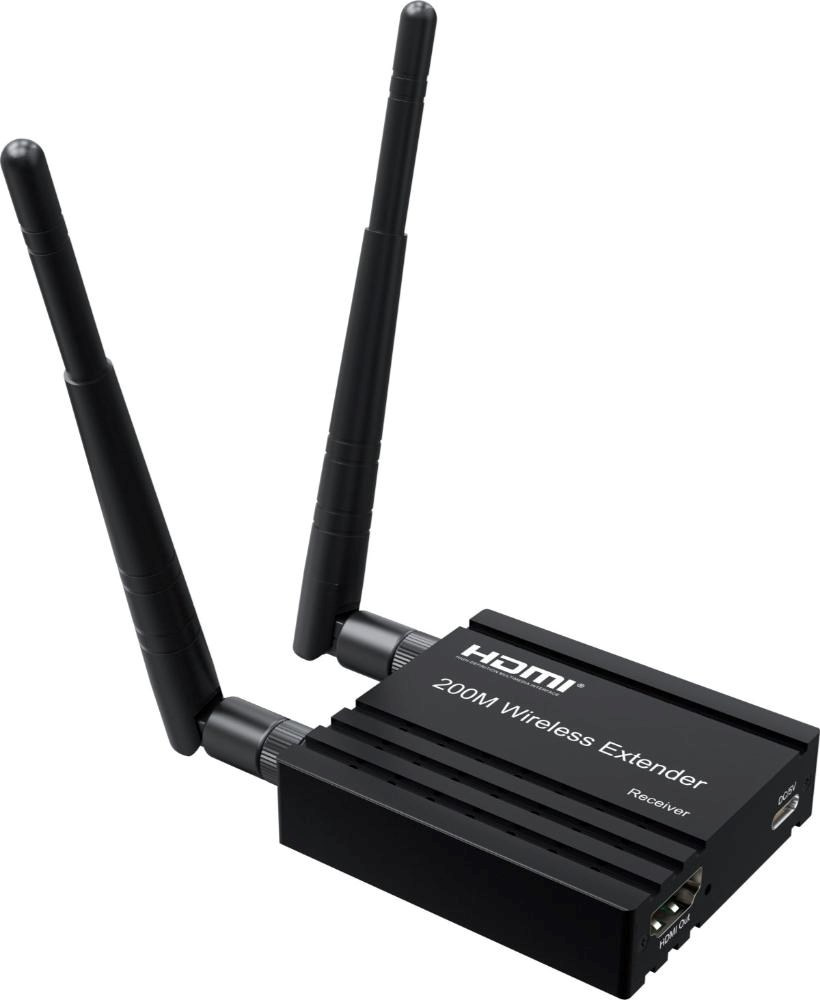 - Bezdrôtový vysielač a prijímač signálu HDMI umožňuje pripojiť HDMI monitor alebo projektor na vzdialenosť až 200m na otvorenom priestranstve.