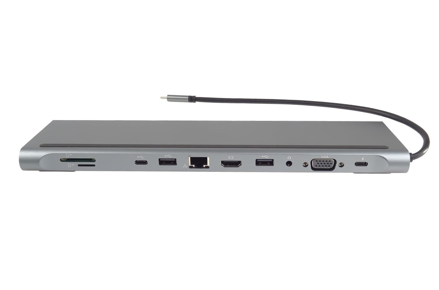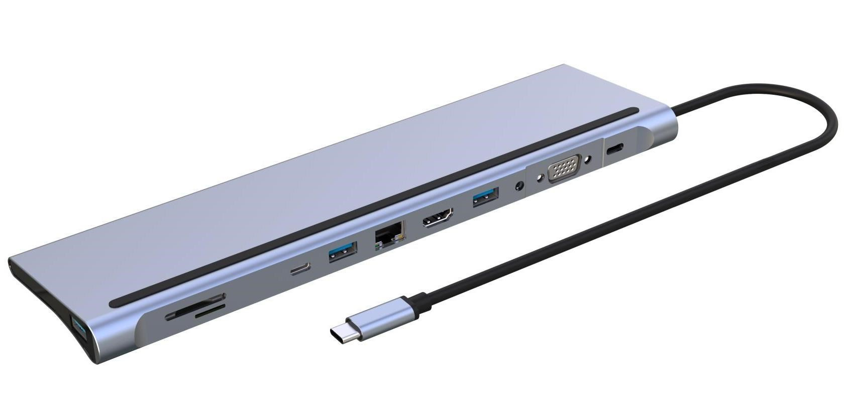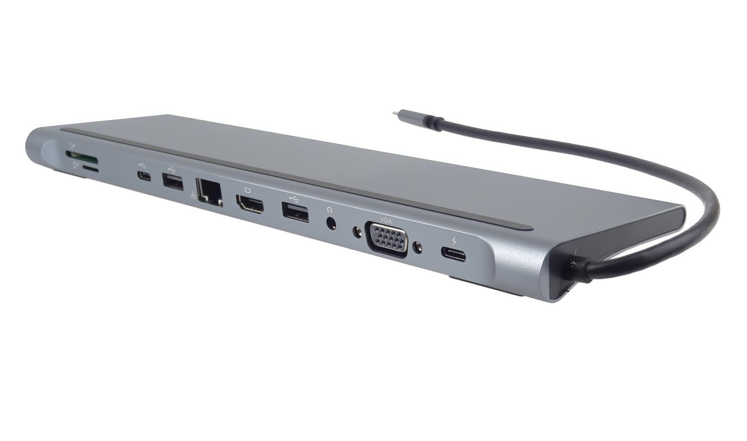 PREMIUMCORD Dokovací stanice USB-C 10v1, 1xHDMI, 1xVGA, 2xUSB-C, 3xUSB, 1xRJ45, čtečka SD karet, šedá