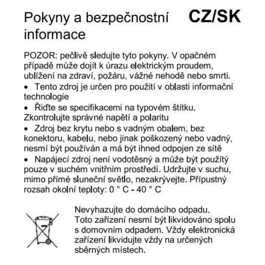 - výstupný konektor: vonkajší priemer konektoru: 5,5mm, vnútorný priemer konektoru: 2,1mm