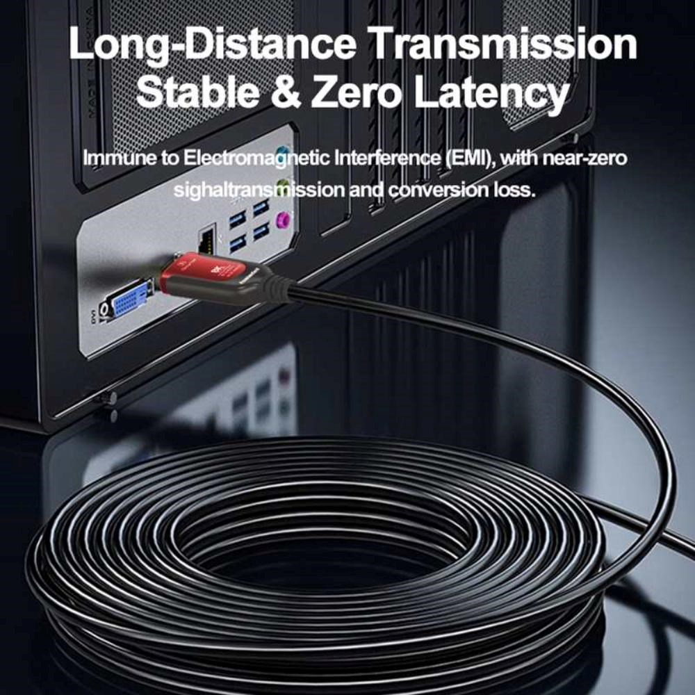 - Optický AOC kabel se vyznačuje vynikajícím přenosem signálu na velké vzdálenosti beze ztrát, je odolný proti elektromagnetickému rušení a dává nejlepší možný obraz ve srovnání s metalickými kabely