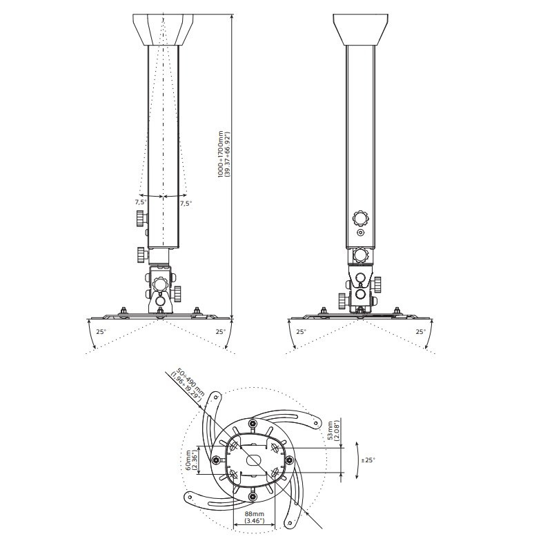 Profesionálny dizajnový stropný držiak na projektor EDBAK PMV300 Stropný držiak na zavesenie projektora s hmotnosťou do 15kg, najvyššia kvalita, dizajn, nastaviteľnosť 100-170cm Ne vždy je možné použiť obyčajný stropný držiak na projektory, niekedy je potrebné použiť držiaky najvyššej kvality a krásneho dizajnu. My Vám takýto držiaky na projektory ponúkame. Komplexná rada profesionálnych stropných držiakov na projektory v nádhernom dizajnovom prevedení. Držiaky sú plne nastaviteľné, vhodné pre 99% dostupných projektorov a dataprojektorov. Farba čierna alebo biela. Záruka 5 rokov. Ak vám záleží na dizajne rovnako ako na kvalite, ste na správnej stránke. Profesionálny stropný držiak projektora s nastavením dĺžky, otočný a sklopný, najvyššia kvalita Edbak PMV300Dĺžkovo nastaviteľný stropný držiak na projektor Edbak PMV300 Technické údaje: nosnosť 15kg univerzálny držiak na uchytenie 99% dostupných projektorov na projektory so 3 alebo 4 otvormi pre uchytenie rozstup otvorov pre uchytenie v rozmedzí 50-490mm dĺžkové nastavenie 1000mm až 1700mm otáčanie do strán +/- 360° sklon do strán +/- 25° sklon nahor a nadol +/- 25° korekcia roviny obrazu korekcia nerovnosti stropu +/- 7,5° zaistenie v požadovanej pozícii systém pre skryté vedenie káblov najvyššia kvalita - profesionálne prevedenie nádherný dizajn biele alebo čierne prevedenie záruka 5 rokov Profesionálne stropné držiaky Edbak PMV sú dĺžkovo nastaviteľné, otočné a sklápacie, najvyššia kvalita a krásny dizajn Na stropný držiak s nastavením dĺžky 100-170cm EDBAK PMV300 je možné uchytiť všetky projektory, ktoré majú 3 alebo 4 otvory so závitom s rozstupom 50mm až 490mm. Vďaka najvyššej kvalite a profesionálnemu prevedeniu sú držiaky EDBAK radu PMV vhodné skutočne kamkoľvek.