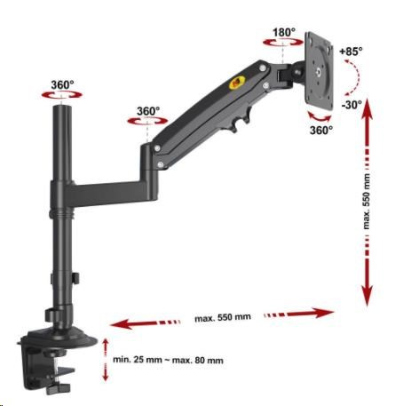 Stolný držiak na monitor Fiber Mounts H100B Stolný držiak na monitory 17-35", plne polohovateľný 3D Špičkový stolný držiak s uchytením na okraj stola alebo kamkoľvek do priestoru. VESA štandard 75x75 a 100x100 na uchytenie monitorov s uhlopriečkou 17-35". Držiak umožňuje plnú nastaviteľnosť polohy monitora: otáčanie do strán, duálne výškové polohovanie, naklápanie, vzdialenosť od uchytenia a rotáciu monitora. Rameno držiaku je osadené plynovým piestom s nastaviteľnou tuhosťou 2-12kg, výškové polohovanie je teda extrémne jednoduché a pohodlné. Farebné prevedenie čierne, záruka 3 roky. Držiak na monitor uchytenie na okraj stola alebo do priestoru, otočný, sklopný, výškové polohovanie, výsuvný - Fiber Mounts H100B Technické údaje: zaťaženie: minimálne 2kg, maximálne 12kg na monitory s uhlopriečkou 17" až 35" VESA štandardy 75x75 a 100x100 duálne výškové polohovanie (ramenom s piestom 250mm + objímkou na nosníku 300mm) celkové nastavenie výšky od stola 0-550mm otáčanie do strán +360° / -360° náklon +85° / -30° rotácia obrazovky - na šírku alebo na výšku dva typy uchytení na stolovú dosku (na okraj stola alebo do priestoru stolovej dosky) uchytenie na stolovú dosku o priemere 25-80mm systém pre usporiadanie káblov farebné prevedenie čierne záruka 3 roky