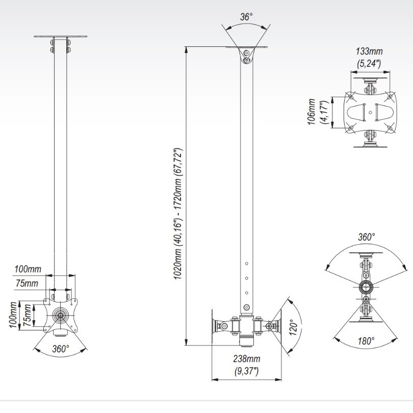 EDBAK SV35 stropné držiak na 2 monitorky Profesionálny stropný držiak na 2 obrazovky 17-43", výškové nastavenie, otáčanie, náklon Špičkový stropný držiak na zavesenie 2 televízorov alebo monitorov. Držiak umožňuje dĺžkové nastavenie, nezávislé otáčanie jednotlivých obrazoviek a ich naklonenie. Profesionálna konštrukcia. Dodávame v čiernom alebo striebornom prevedení. Záruka 5 rokov. Profesionálny stropný držiak na 2 obrazovky, nastavenie dĺžky, otáčanie, náklon - EDBAK SV35 Technické údaje: max. zaťaženie 30kg podporuje VESA štandardy 75x75 a 100x100 možnosť rozšírenia VESA na 200x100 alebo 200x200 vhodné na monitory a Tv 17" až 43" minimálna dĺžka držiaku 1020mm maximálna dĺžka držiaku 1720mm nastavenie dĺžky podľa potreby v uvedenom rozmedzí nezávislé otáčanie každého monitoru v rozmedzí +90° / -90° nezávislé naklonenie každého monitora v rozmedzí +60° / -60° možnosť uchytenia držiaku na zvislé stropné konštrukcie 0° až 18° korekcia roviny obrazoviek horizontálne aj vertikálne otočenie obrazoviek - funkcia PIVOT bezpečné zavesteňie 2 obrazoviek profesionálna konštrukcia farba čierna alebo strieborná záruka 5 rokov Stropný držiak na 2 obrazovky EDBAK SV35 podporuje VESA štandardy: VESA 75x75 VESA 100x100 VESA 200x100 za príplatok VESA 200x200 za príplatok