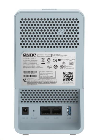 Pouze na pripojenie USB donglu úložiska pre FTP službu na smerovačiBluetooth Verzia 5 Zisk antény Bluetooth 2,3dBi Tlačidlo Reset, WPS Napájanie 12 V DC Spotreba energie 24 W Rozmery 68x100x175,5 mm Hmotnosť 0,44 kg Hmotnosť balenia 1,11 kg Prevádzková teplota 0°C ~ +40°C Prevázková vlhkosť 5 až 95 % bez kondenzácie Certifikácia JATE / CE / FCC / BSMI / NCC / IC / SRRC / VCCI / RCM / OFCA Wi-Fi Mesh ✓ (se trípásmovou) Riešenie QNAP SD-WAN, QuWAN ✓