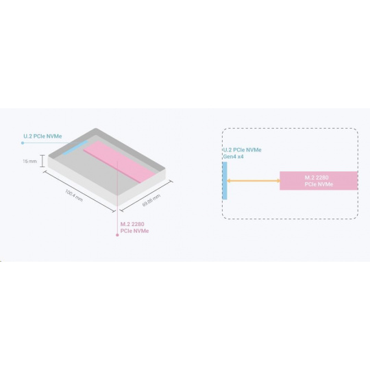 Produkt QDA-UMP4 umožňuje inštalovať jeden M.2 PCIe 4.0 x4 NVMe SSD do 2,5” diskovej pozície U.2 (SFF-8639) PCIe 4.0 x4 NVMe SSD. Pre zariadenie QDA-UMP4 nie je potrebný žiadny ďalší softvér ani ovládače a možno ho nainštalovať do počítača/pracovnej stanice (Windows®, Linux®) alebo QNAP NAS, aby bolo možné používať disky M.2 SSD ako cenovo dostupnú alternatívu drahým diskám U.2 SSD.