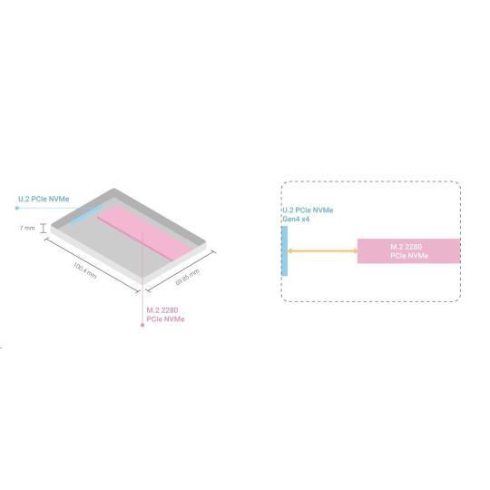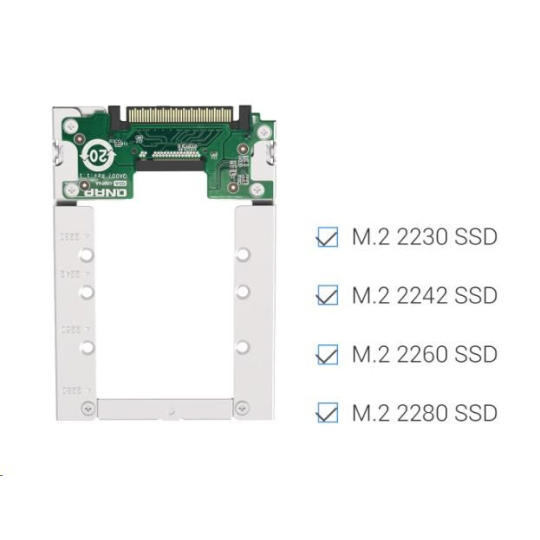 Ľahký QDA-UMP4A umožňuje inštalovať M.2 PCIe NVMe SSD do 2,5” slotu pre U.2 (SFF-8639) PCIe NVMe SSD zariadenie QNAP NAS. (M.2 SSD je predávané samostatne)